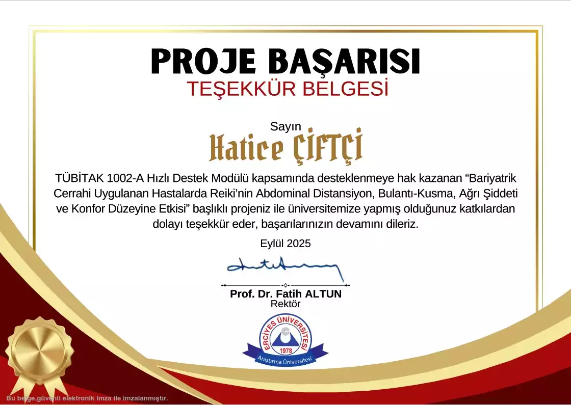 Enstitümüz doktora öğrencisi Hatice ÇİFTÇİ'nin, TÜBİTAK 1002-A Hızlı Destek Modülü kapsamında desteklenmeye hak kazanan "Bariyatrik Cerrahi Uygulanan Hastalarda Reiki'nin Abdominal Distansiyon, Bulantı-Kusma, Ağrı Şiddeti ve Konfor Düzeyine Etkisi" başlıklı projesi ile Üniversitemize yapmış olduğunuz katkılardan dolayı teşekkür eder, başarılarınızın devamını dileriz.